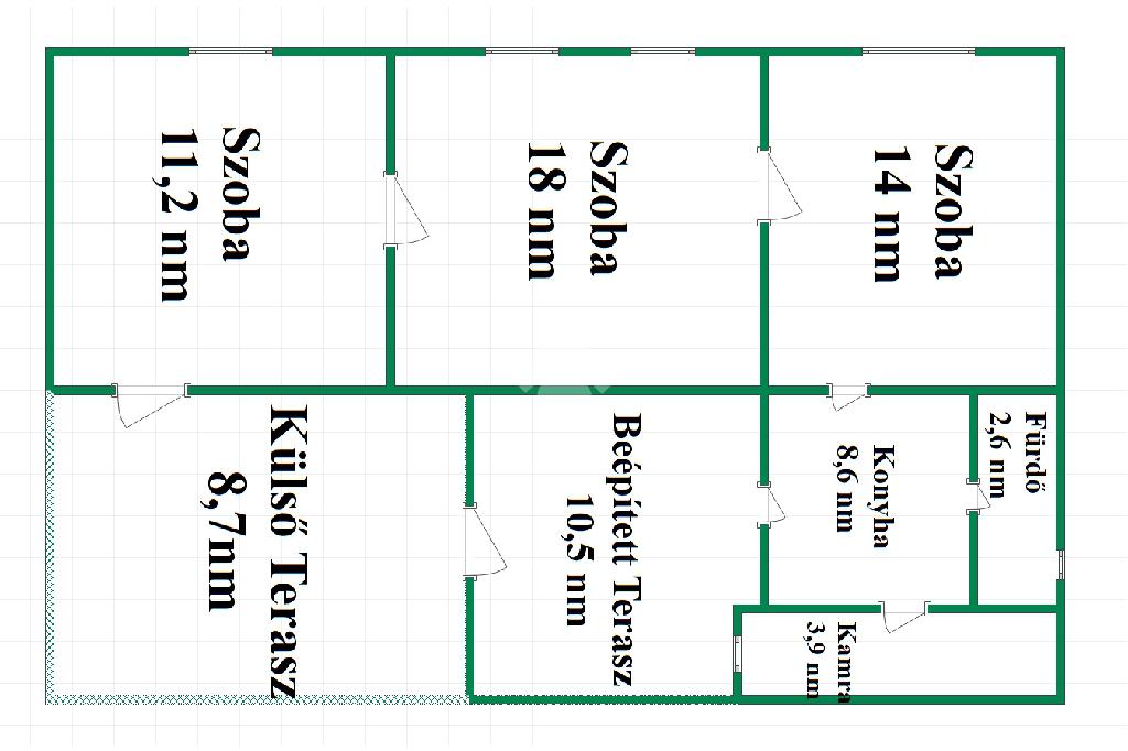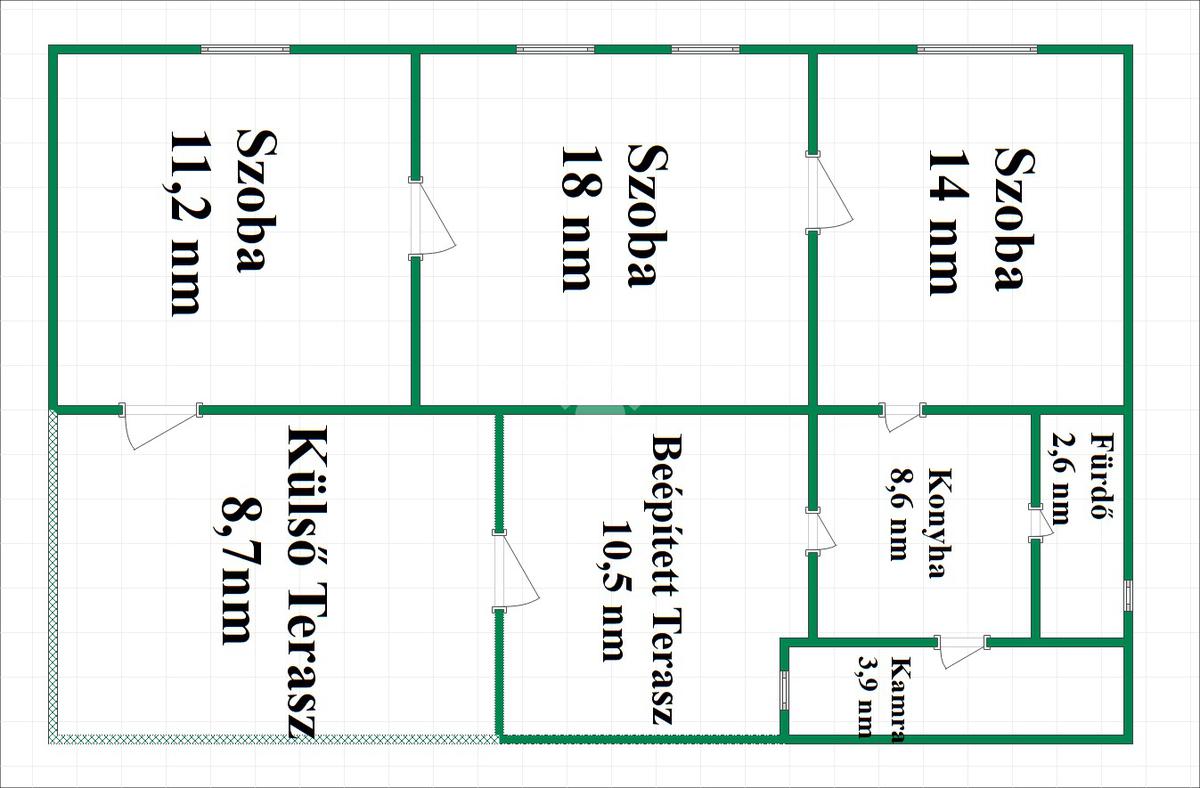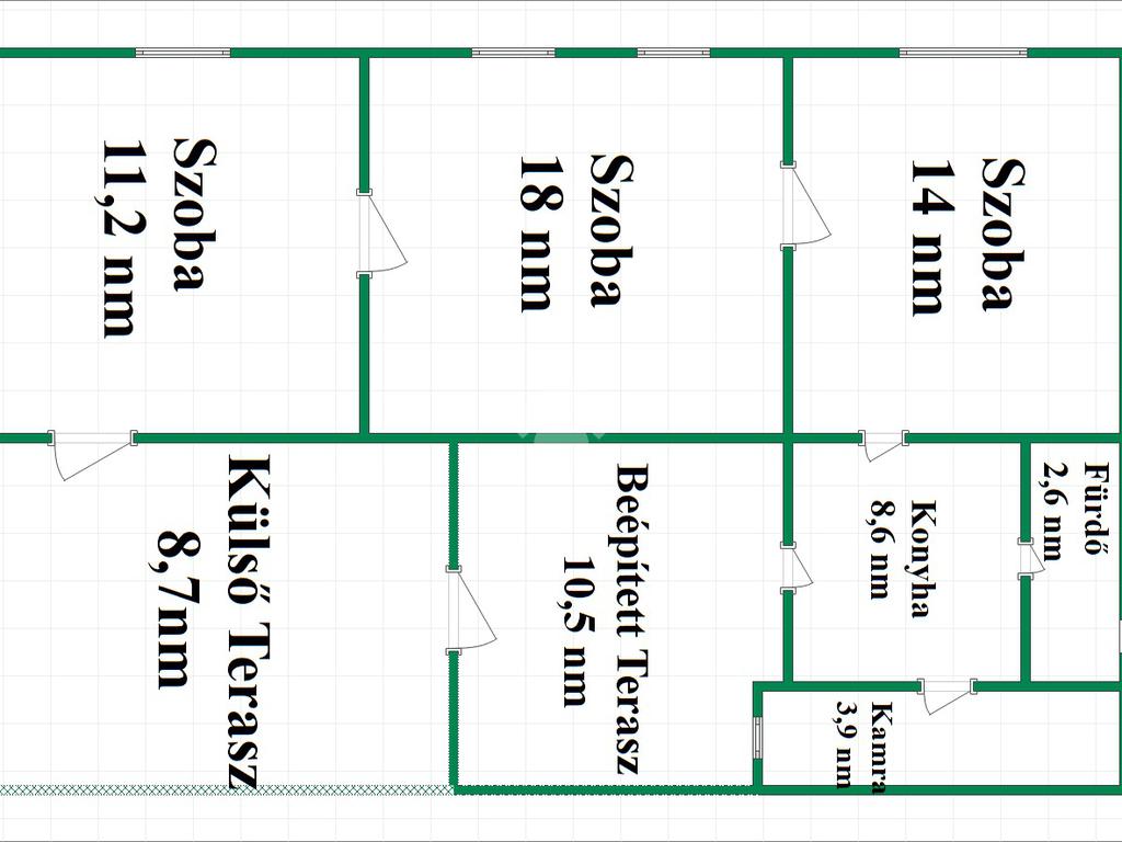 Elosztását tekintve 3 szobával, konyhával, fürdőszobával, spájzzal, beépített terasszal rendelkezik.