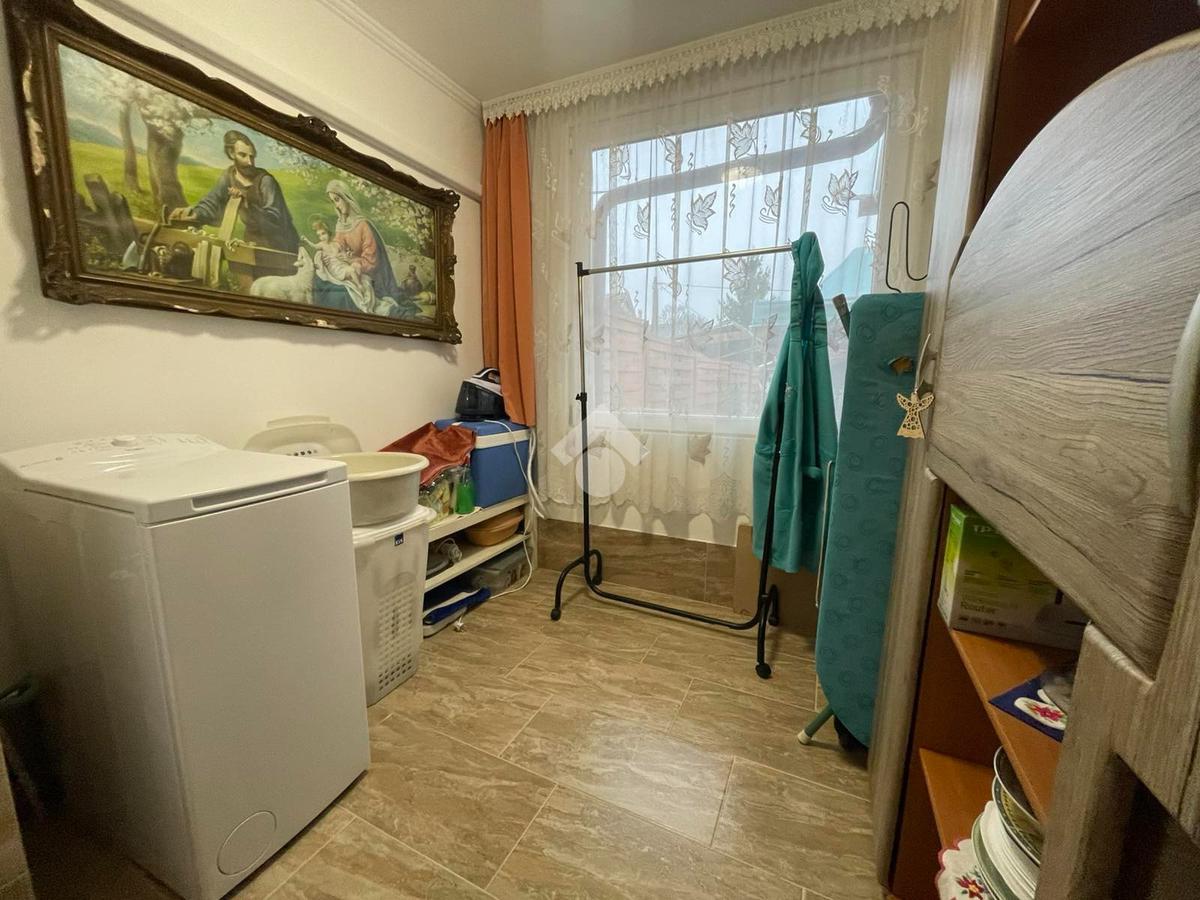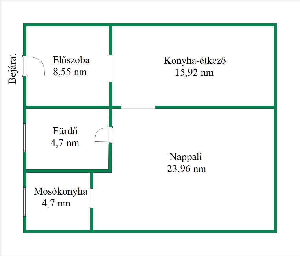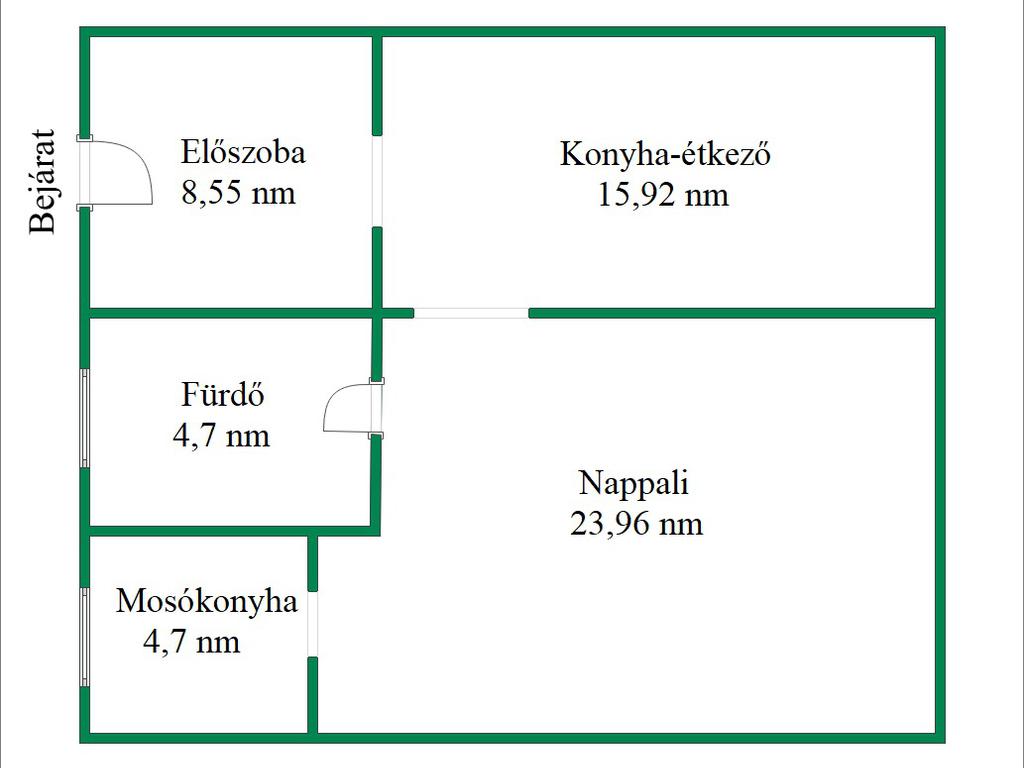 Elosztás: előszoba, konyha–étkező, nappali, zuhanyzós fürdő-WC, mosókonyha.