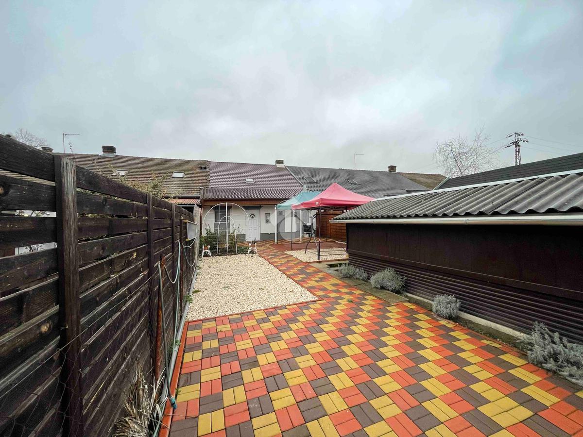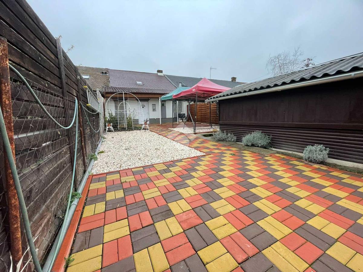 A házhoz 120 nm saját kert tartozik viakolor burkolattal, továbbá 18 nm-es garázs és kocsibeálló. A gáz telken belül, de az lakásban nincs bent.