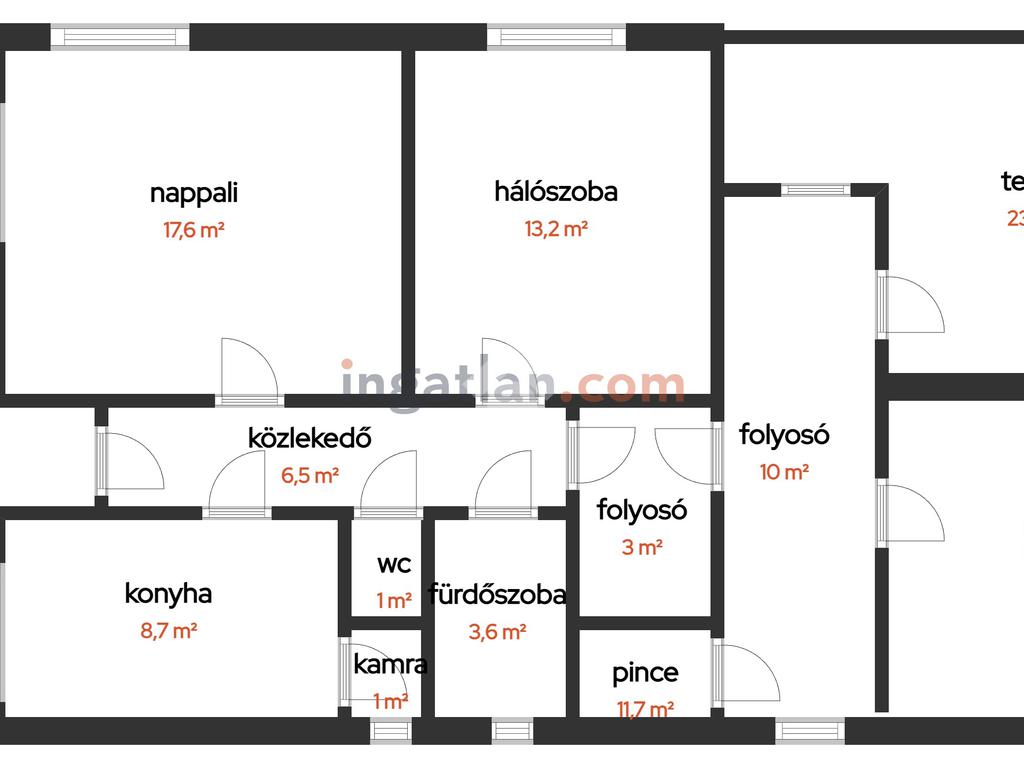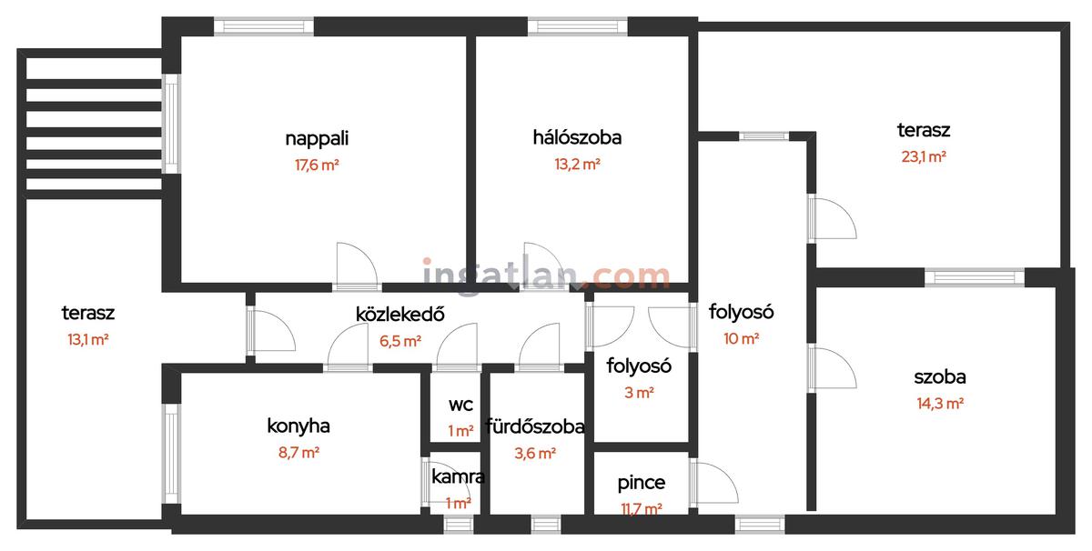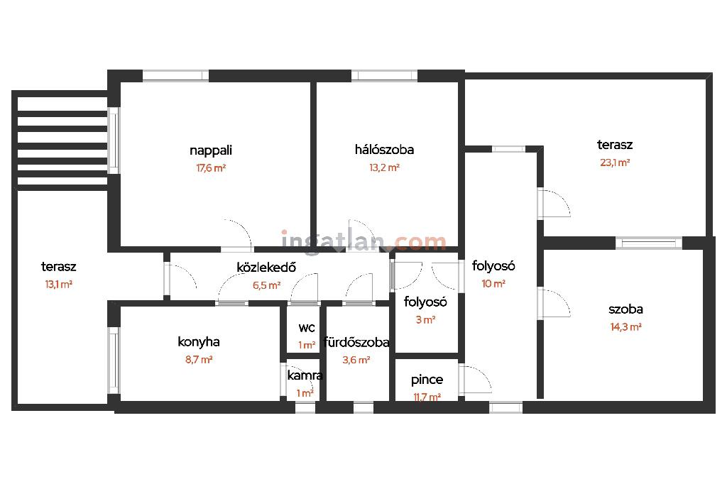 Az elrendezés praktikus: nappali + 2 szoba, közlekedő, konyha, spejz, külön WC és fürdőszoba került kialakításra, valamint két terasz is növeli a komfortérzetet. Az ingatlanhoz tartozik egy 9 nm-es pince is, amely ideális tárolásra.